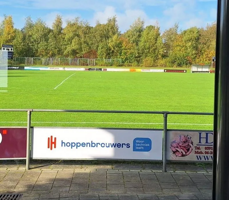 En sinds kort hangt er ook een Hoppenbrouwers reclamebord langs het hoofdveld, een mooie zichtbare uiting van deze samenwerking.